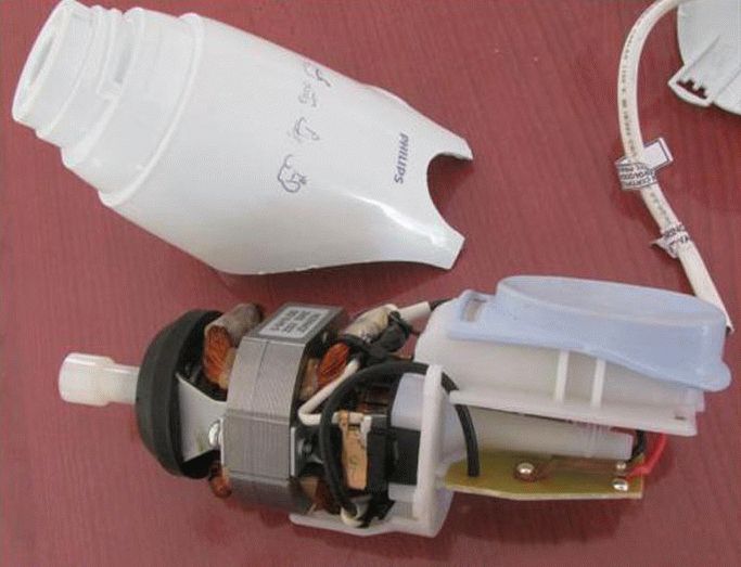 Перед нами механизм прибора: мотор, плата, провода и все остальное. Очень частая поломка во многих современных электроприборах — терморезистор. Он же предохранитель.