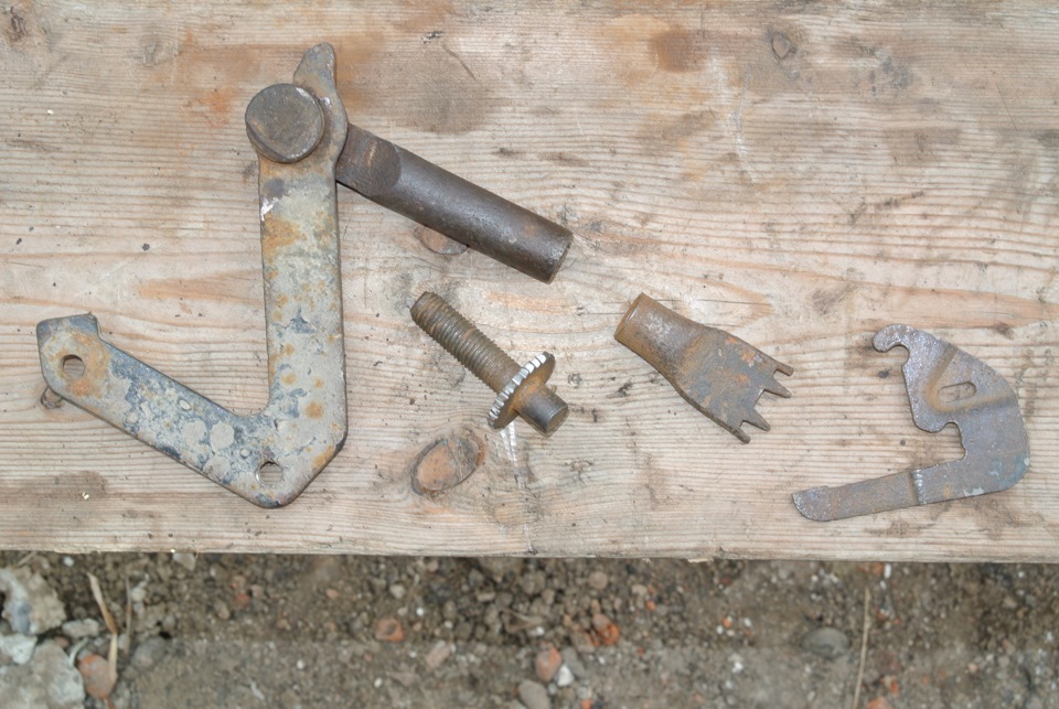 Рычаг ручника на самом деле состоит из четырёх частей. Их надо обязательно разъединить, почистить, резьбу смазать, шарнир разработать. На правом рычаге шарнир настолько закис, что мне пришлось его полностью разобрать. На левом еле смог выкрутить регулировочный винт, отмачивал WD’шкой, обстукивал рычаг снаружи.