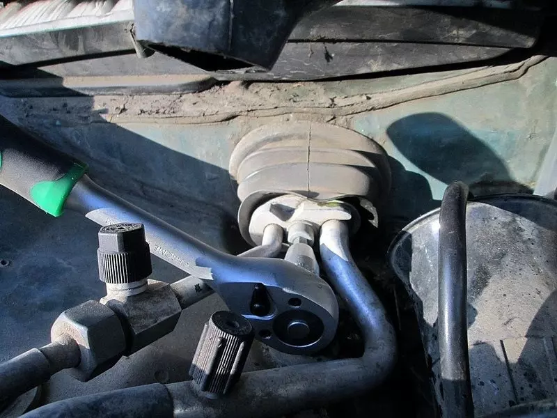 Снимаем два шланга от кондиционера, которые идут в салон (болт-шестигранник). Фреон при этом весь выйдет. Не потеряйте два герметичных резиновых колечка в местах соединения.