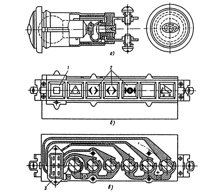 Рис. 12. Сигнализаторы: а — отдельный сигнализатор; б — блок сигнализаторов; в — печатный монтаж блока сигнализаторов; 1 — кнопка проверки исправности ламп блока; 2 — сигнализаторы; 3 — соединительная колодка